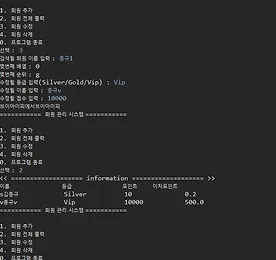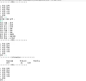 학생에 대한것 그냥 만들기 package kh.java.student.controller; import java.util.Scanner; import kh.java.student.model.vo.Student; public class StudentMgr { Scanner sc = new Scanner(System.in); int index=0; Student [] stu = new Student[20]; String name; int q=0; int sum; public void start() { while(true) { System.out.println(" > >"); System.out.println(""); System.out.println("1. 학생 등록"); System.o.. 더보기 포인트 관리 프로그램(인터페이스를 만든후 그걸토대로만들기) ---------------------------------------------------------------------------------------------------------------------------------------------------package kh.java.point.run; import kh.java.point.controller.PntMgr;import kh.java.point.controller.PntMgr2; public class Run {public static void main(String[] args) {// PntMgr mgr = new PntMgr(); PntMgr2 mgr2 = new PntMgr2();// mgr.insertData(new Silve.. 더보기 자바 강제 타입 변환(Casting) 강제 타입 변환(Casting) 강제 타입 변환(Casting)은 부모 타입을 자식 타입으로 변환하는 것을 말한다. 그렇다고 해서 모든 부모 타입을 자식 클래스 타입으로 강제 변환할 수 있는 것은 아니다. 자식 타입이 부모 타입으로 자동 변환한 후, 다음 자식 타입으로 변환할 때 강제 타입 변환을 사용할 수 있다. ex)Parent parent = new Child(); //자동 타입 변환이거라면 부모메소드 꺼만 쓸수 있고 자식메소드 꺼는 못쓴다. Child child = (child)parent; //강제 타입 변환이렇게 해줄경우 자식꺼를 쓸 수있다.당연히 부모껏도 쓸수 있다.-----------------------------------------------------------------------.. 더보기 이전 1 ··· 53 54 55 56 57 58 59 ··· 70 다음