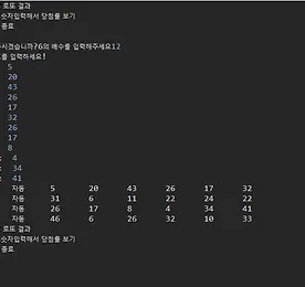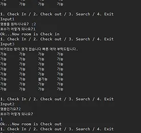 메소드 나눠쓰는 법 MethodMethod의 개념1. 인수를 전달 받아 일련의 작업을 수행한 뒤 그결과를 반환하는 코드2. 코드를 기능별로 분할 관리하여 가독성을 높이고 에러 검출에 용이3. 코드 재사용으로 인해 개발 및 유지 보수시간을 단축 Method의 정의 접근_제한자 [지정_예약어] 결과형_리턴값 메소드명 (매개_변수들) [throws 예외_클래스들]{내용부;내용부;..........내용부; } package jongkyu.java.test.function; import java.util.Random;import java.util.Scanner; public class test111 {public static void main(String[] args) {Scanner sc = new Scanner(System.in.. 더보기 자바 2차원배열 방예약하기 package jongkyu.roomsearch; import java.util.Random;import java.util.Scanner; public class Roomsearch {Scanner sc = new Scanner(System.in);Random r = new Random();int room1;int room2;int check;int number; public void roomsearch() { System.out.print("층수를 입력하세요 : ");room1 = sc.nextInt();System.out.print("방수를 입력하세요: ");room2 = sc.nextInt(); int [][]room= new int[room1][room2]; for(int i=0; i=0; j--.. 더보기 로또 생성 package jongkyu.lotto; import java.util.Random;import java.util.Scanner; public class Lotto {Scanner sc = new Scanner(System.in);Random r = new Random();public void lotto() { while(true) {System.out.println("1. 빠른 로또 결과 ");System.out.println("2. 로또숫자입력해서 당첨률 보기");System.out.print("3. 0은 종료\n");System.out.print("입력 :");int answer = sc.nextInt(); switch(answer) { case 1 : lottocase(); break;case 2.. 더보기 이전 1 ··· 65 66 67 68 69 70 다음